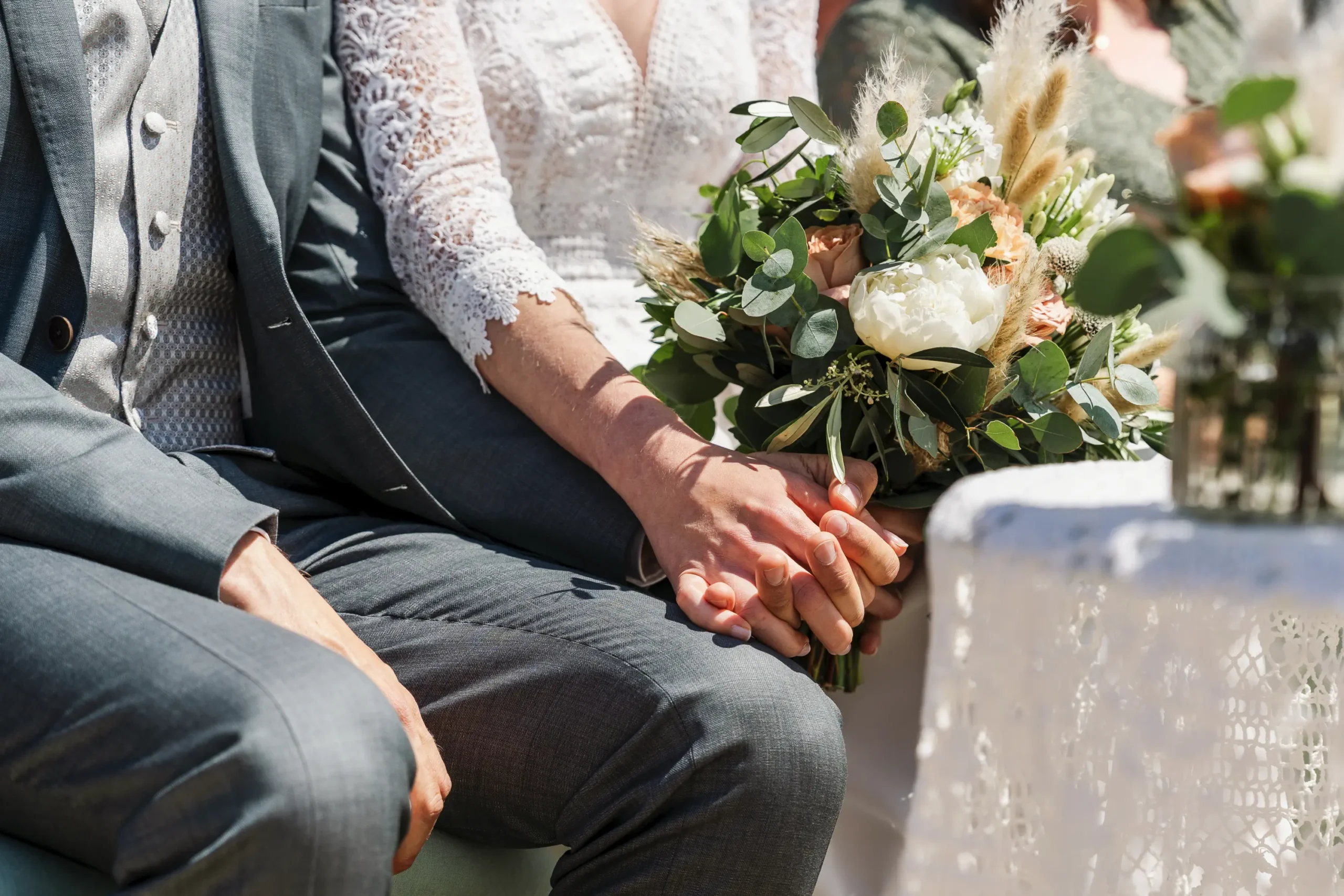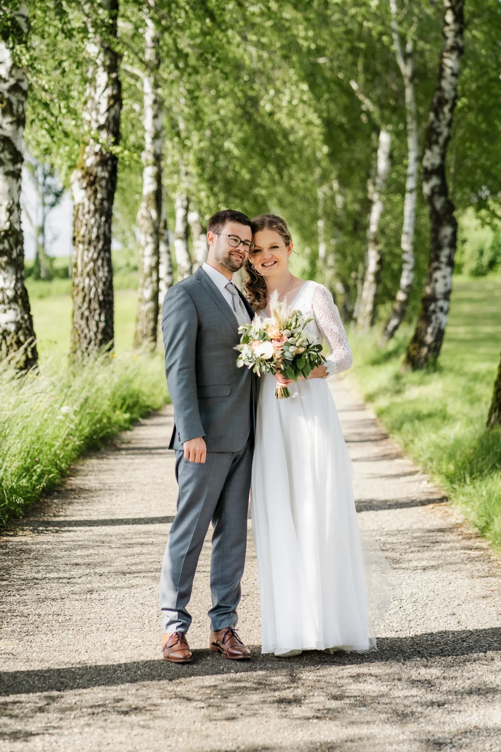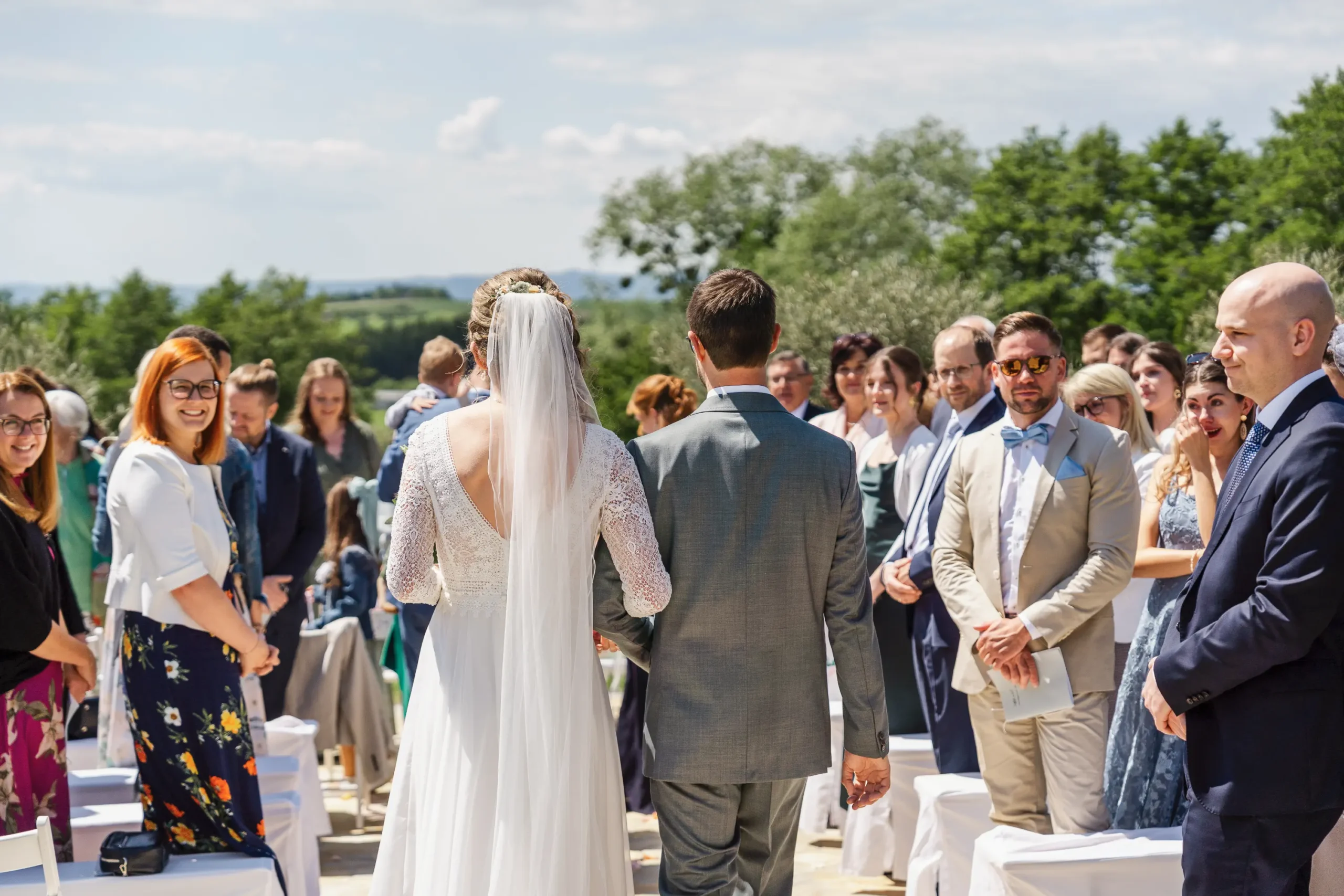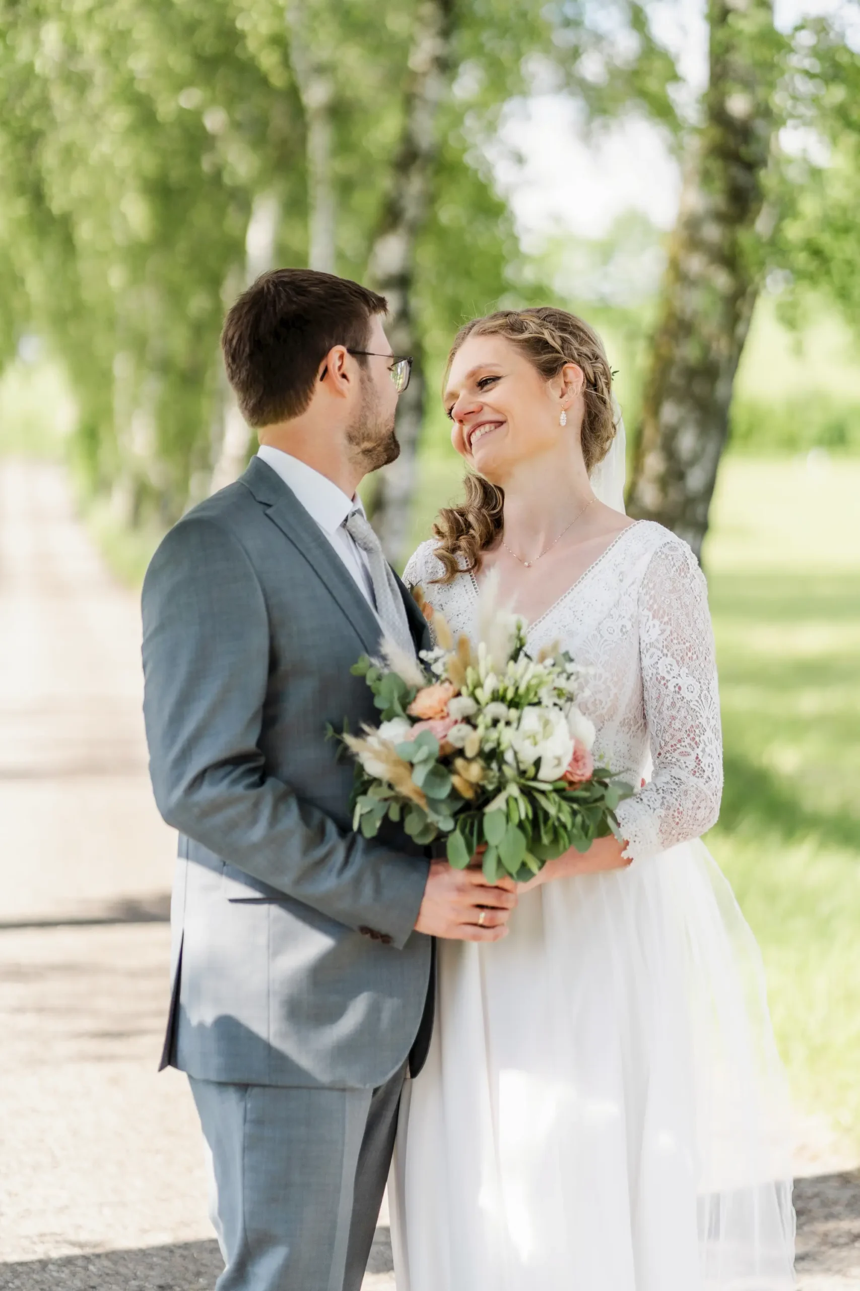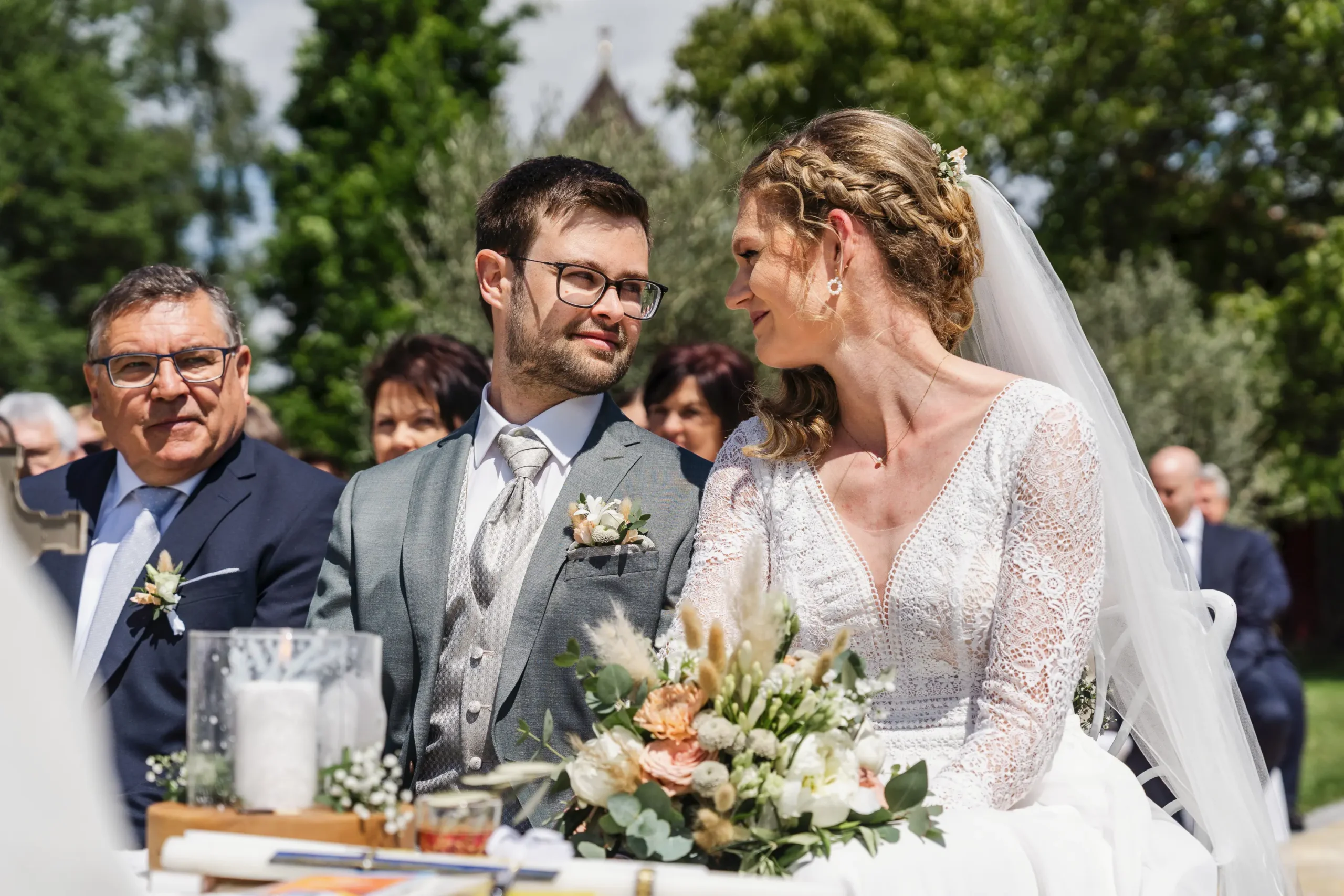 Der Tag begann entspannt mit den Getting-Ready-Momenten. Julia ließ sich von ihrer Familie und ihren Freundinnen beim Ankleiden unterstützen, während Matthias sich gemeinsam mit seinen Trauzeugen vorbereitete. Die Stimmung war voller Vorfreude und Emotionen. Besonders schön waren die vielen Details – vom liebevoll ausgewählten Schmuck über das romantische Brautkleid mit Spitze bis hin zum perfekt abgestimmten Brautstrauß.